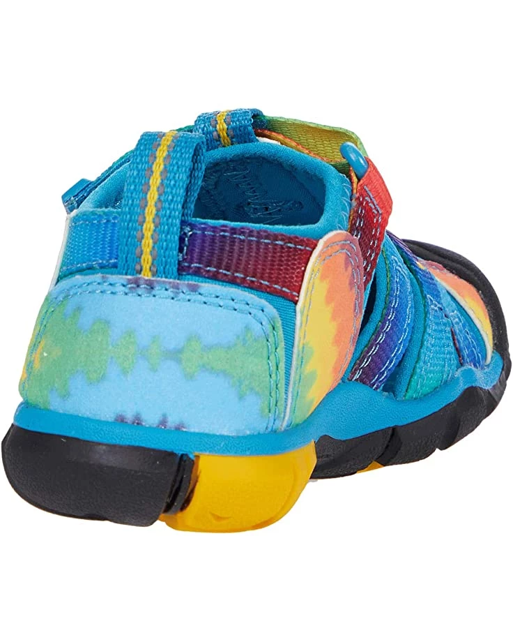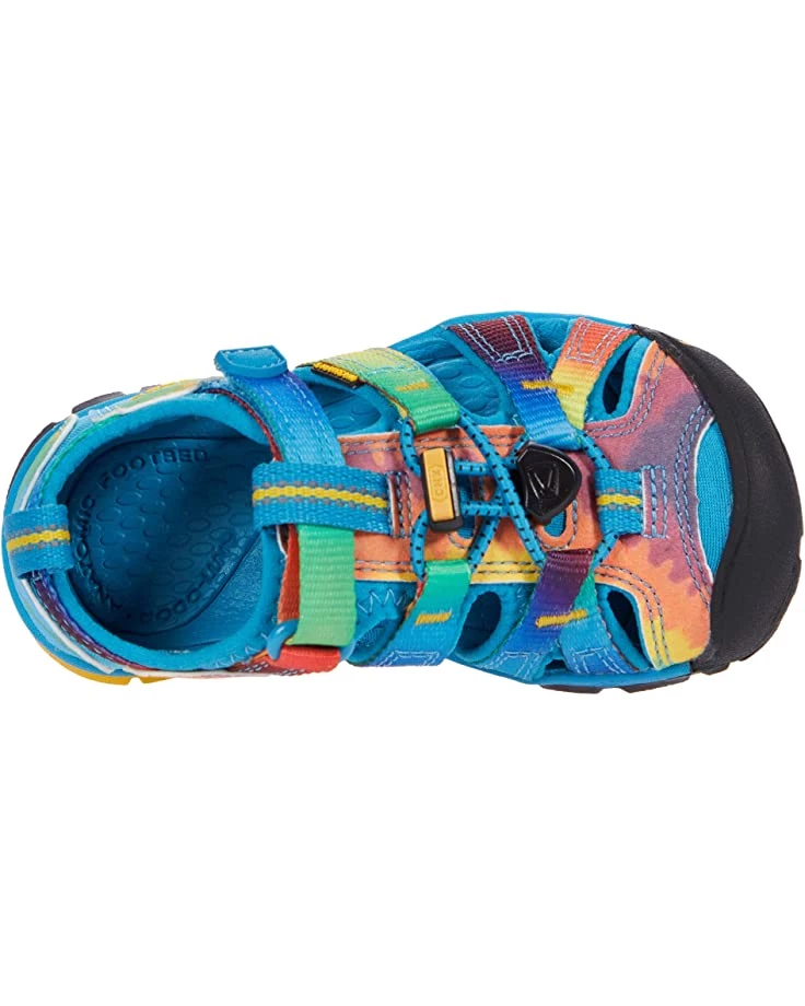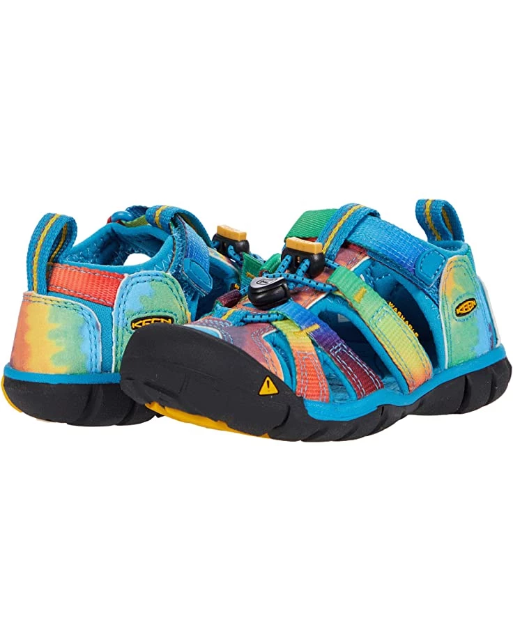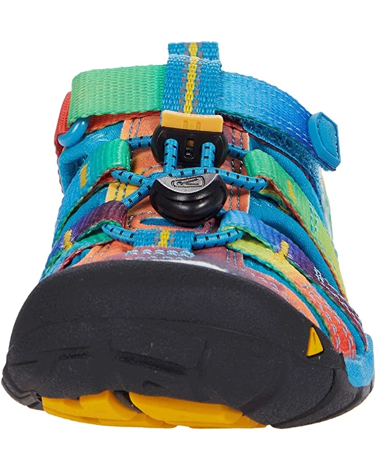 My kids live in these all summer. Durable enough for rugged outdoor trekking and still hand-me-down quality. The only shoes they outgrew before they wear them out. The Newport style is too wide for my kids feet — one of whom has narrow width and the other is more of a normal width, but both swim in the Newport because the toe box is just too wide. The Seacamp fits them both great. These rainbow colored ones are super fun.
