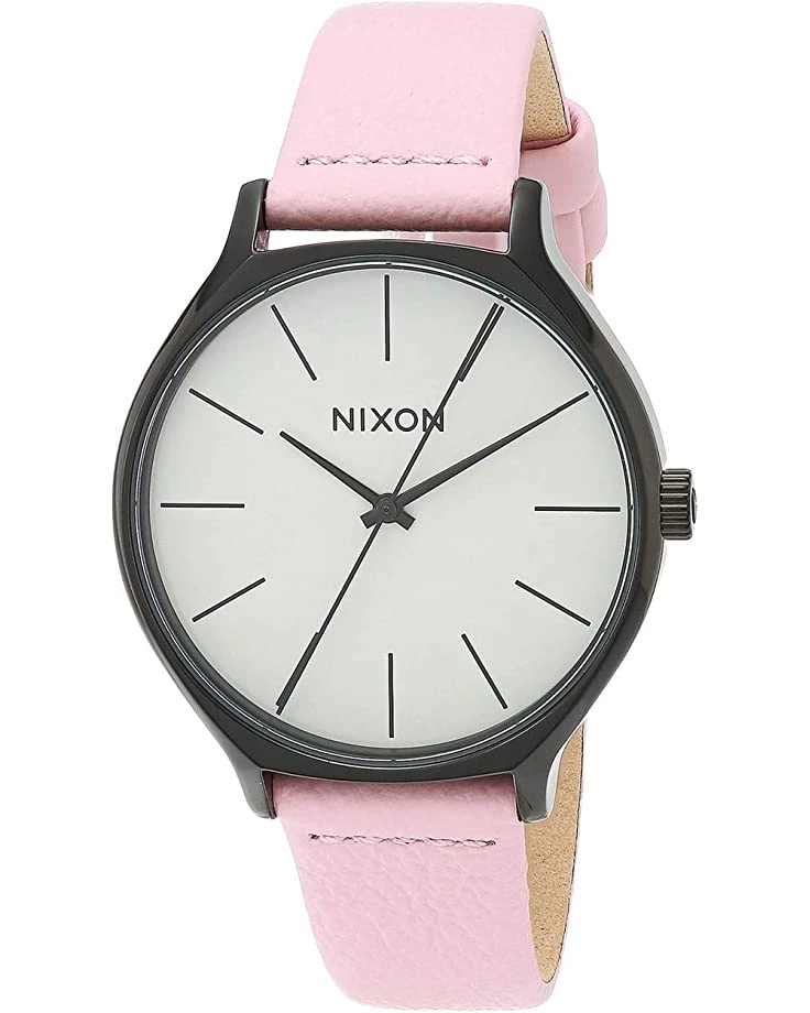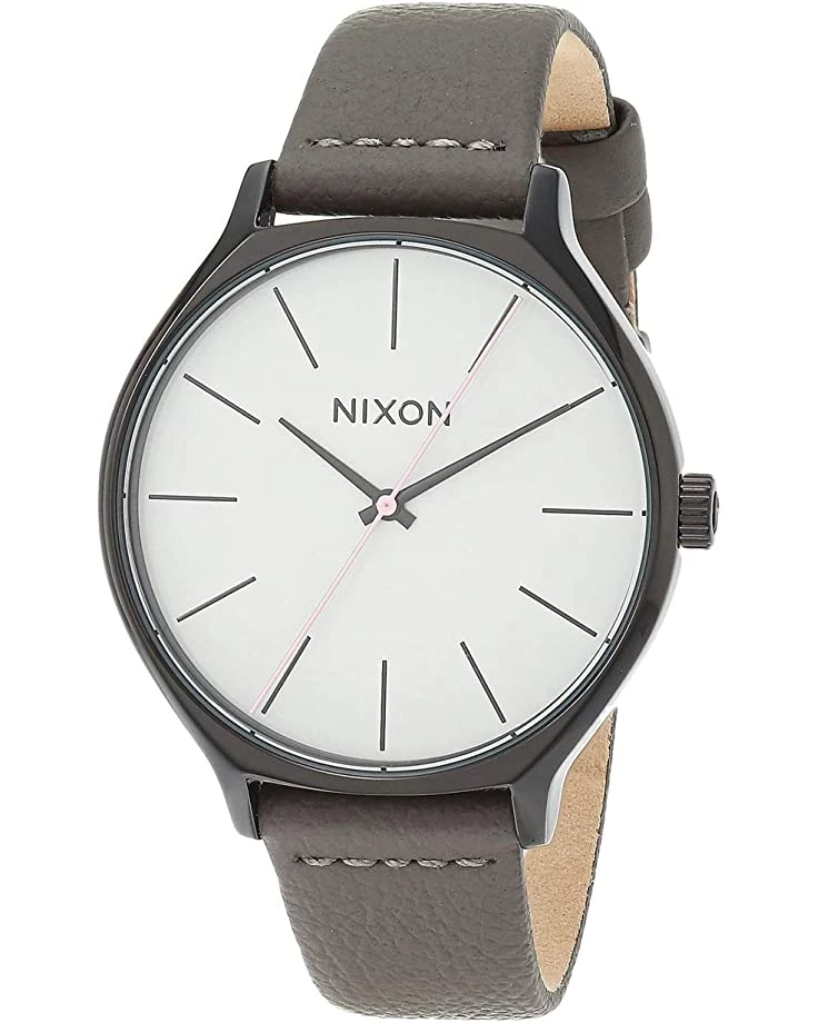 - The Nixon® Clique Leather watch features a slope-cut stainless steel case, leather strap, and a single-prong buckle closure with custom buckle guards.
