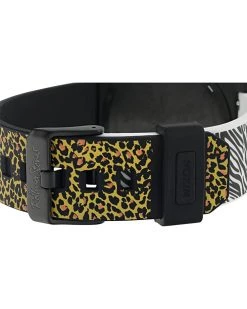 - Stainless steel construction with a printed leather strap.