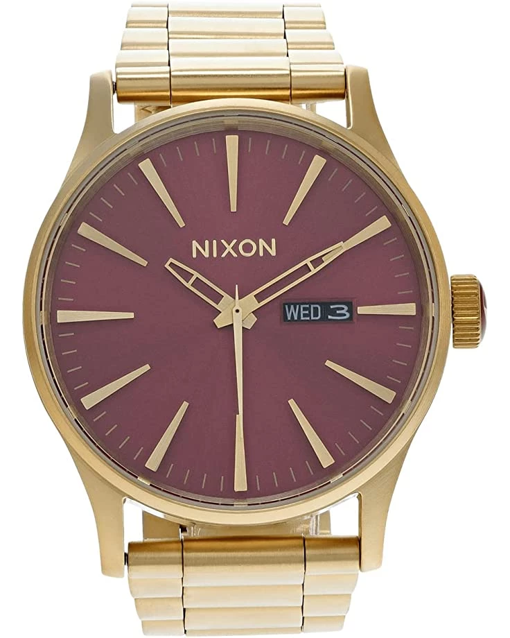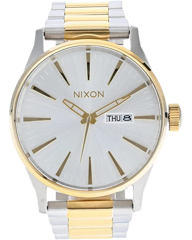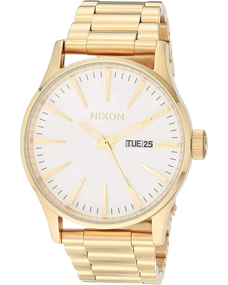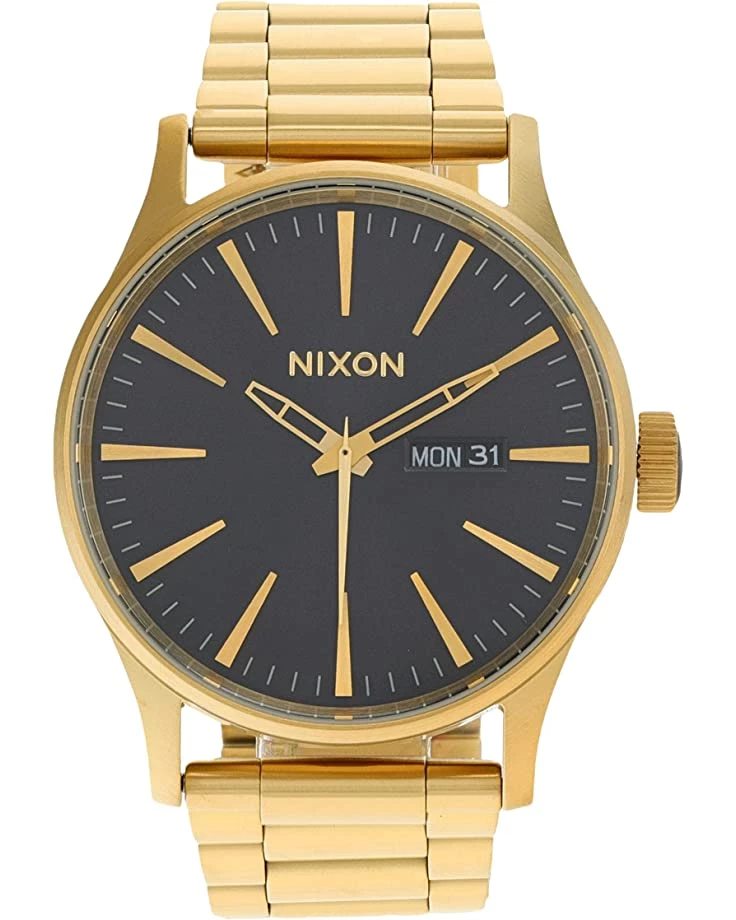 - Dial features gold-tone hands and hour markers, date display window, and Nixon detailing.