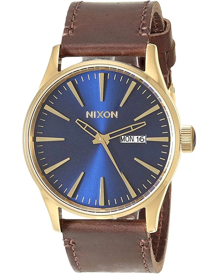 - This Nixon® The Sentry watch is part of The Architect Collection and features a round stainless steel case, adjustable leather wrist strap and Miyota Japanese quartz movement with bilingual day and date window.